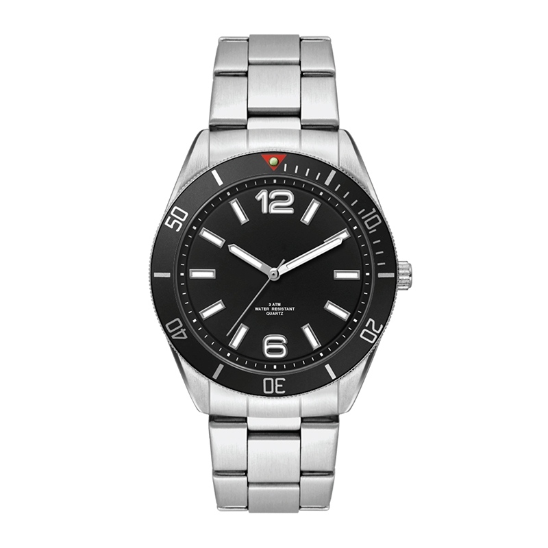 42MM METAL MATTE SILVER CASE, 3 HAND MVMT, BLACK DIAL, BK ROTATING BEZEL, SILVER BRACELET, FLAT MINERAL CRYSTAL, 3 ATM WTR RESISTANT